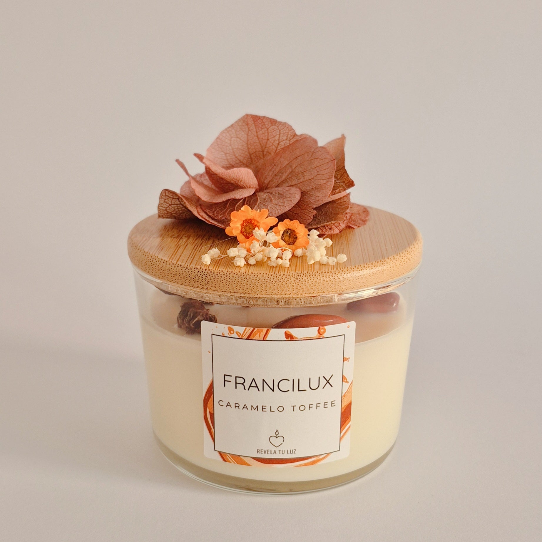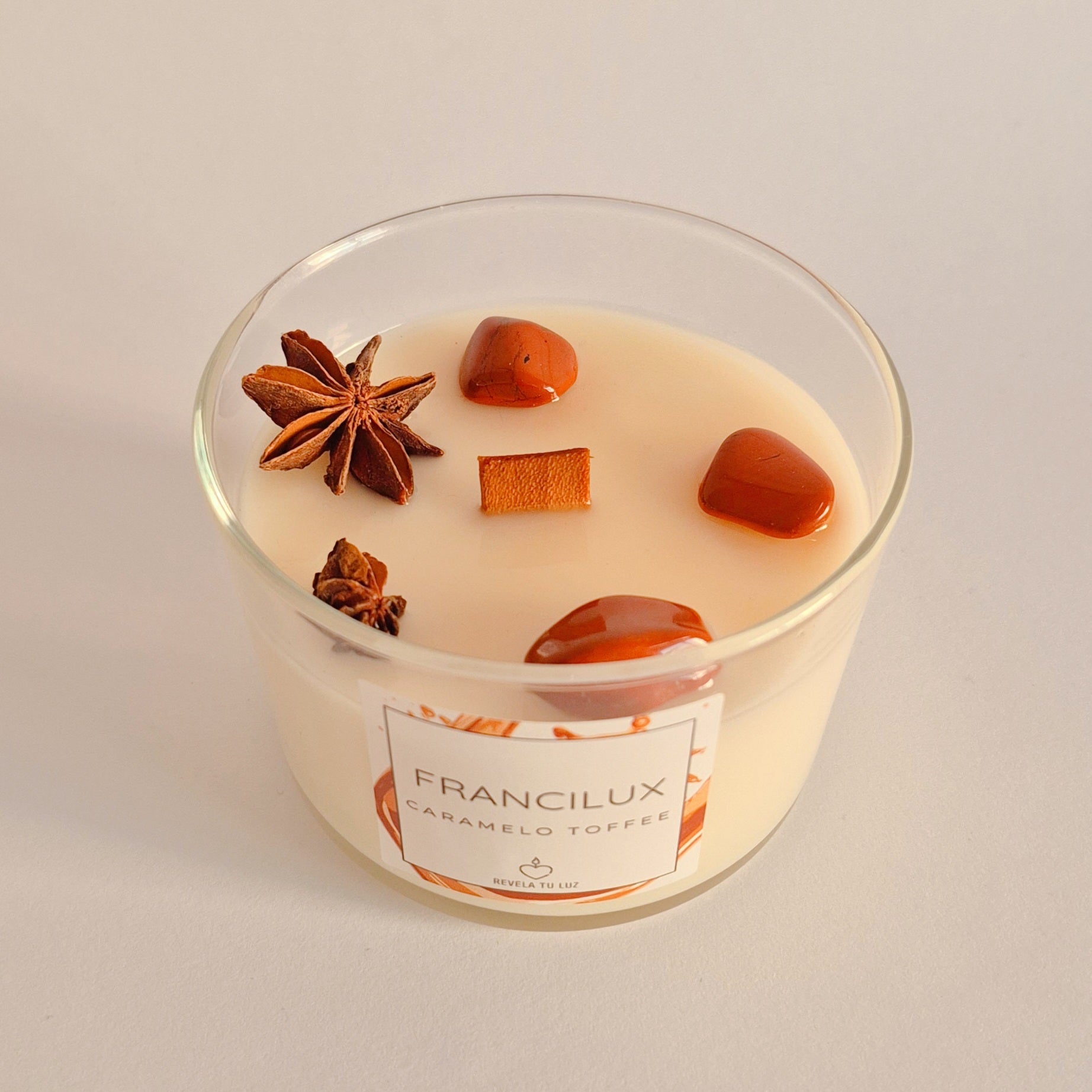 Su fragancia de caramelo toffee envuelve el ambiente con una dulzura profunda y envolvente, creando una sensación de cercanía, abrigo y armonía que invita a compartir y cuidar.