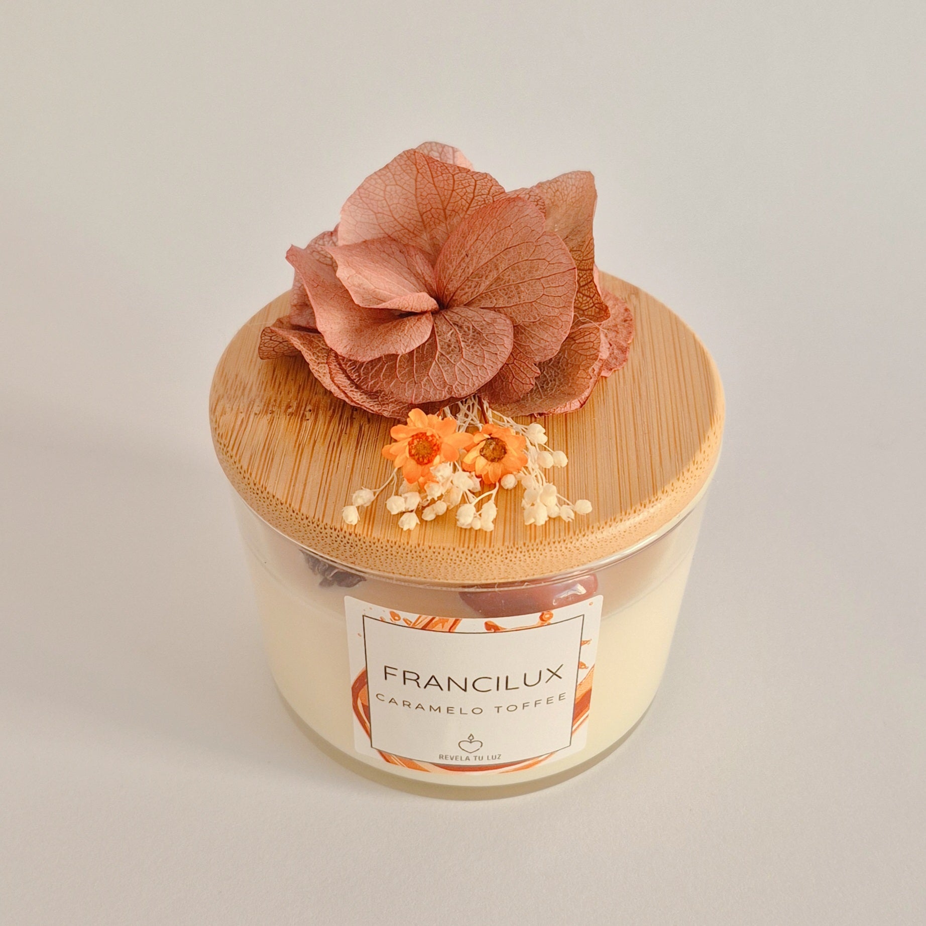 La pieza se completa con una tapa de madera natural y delicadas flores preservadas , que mantienen su belleza durante meses, convirtiendo cada vela en un objeto decorativo con alma incluso después de su uso.