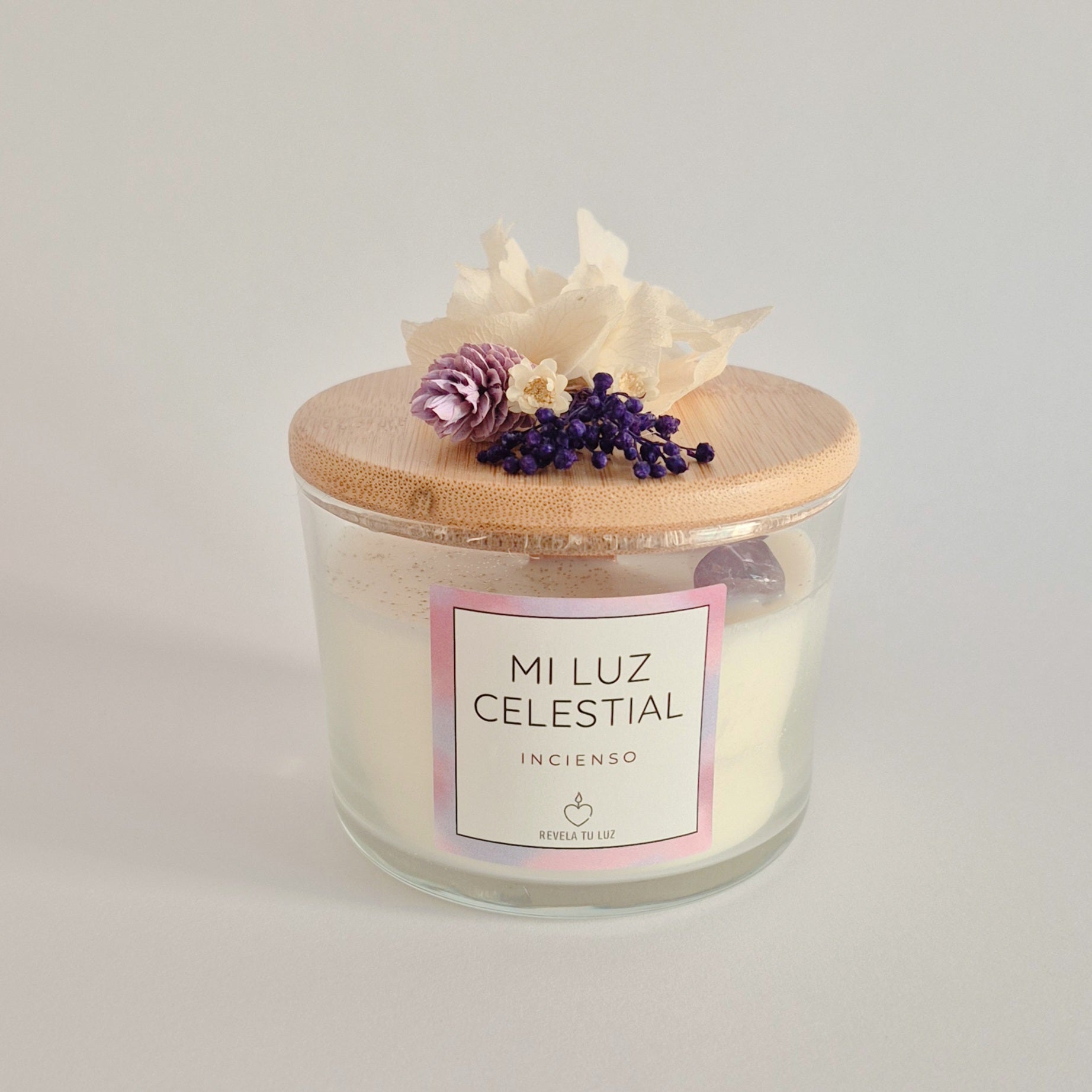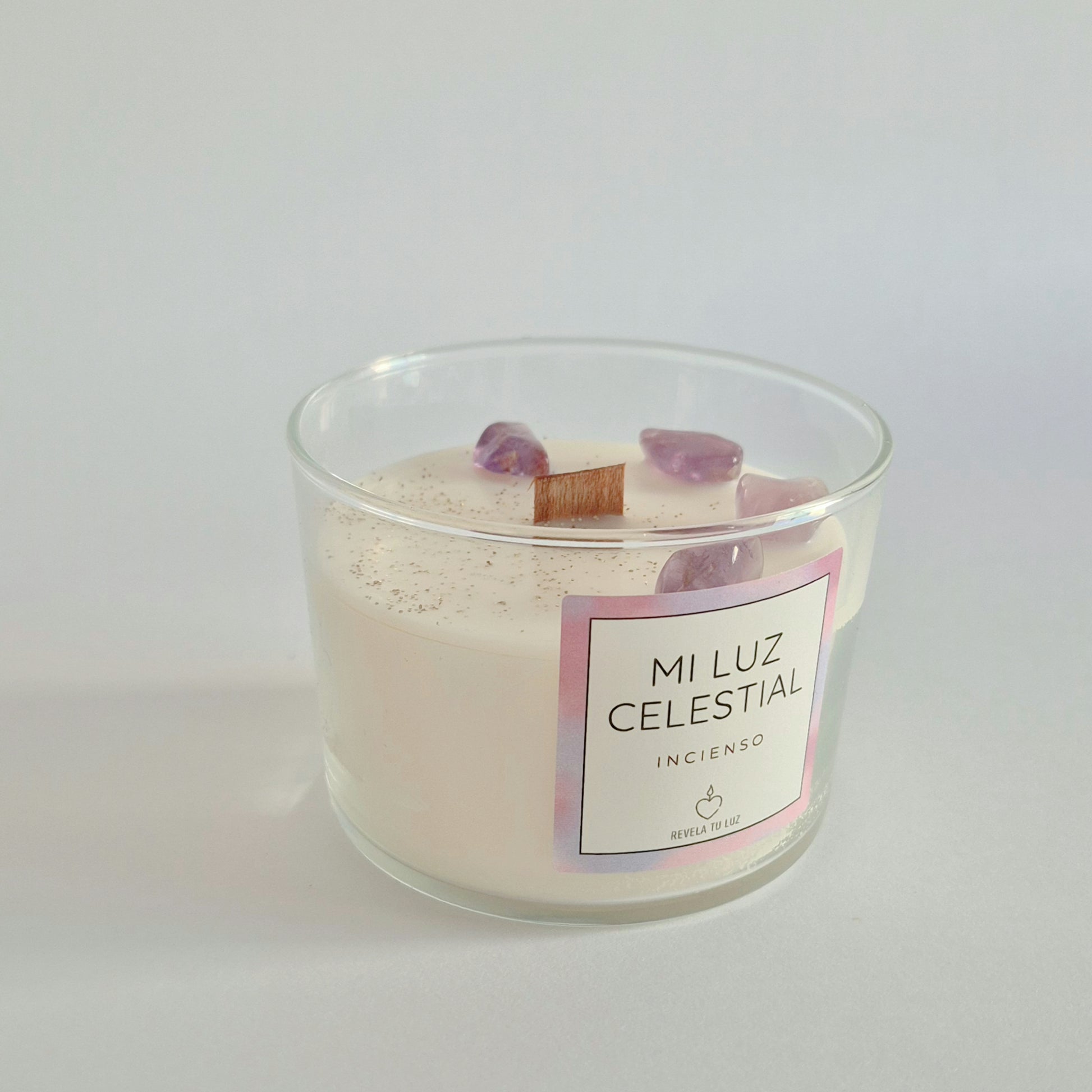 En su interior contiene Amatista , mineral asociado a la espiritualidad, la protección y la claridad mental, decorado con purpurina biodegradable en color oro , que aporta un brillo sutil y etéreo a la llama.