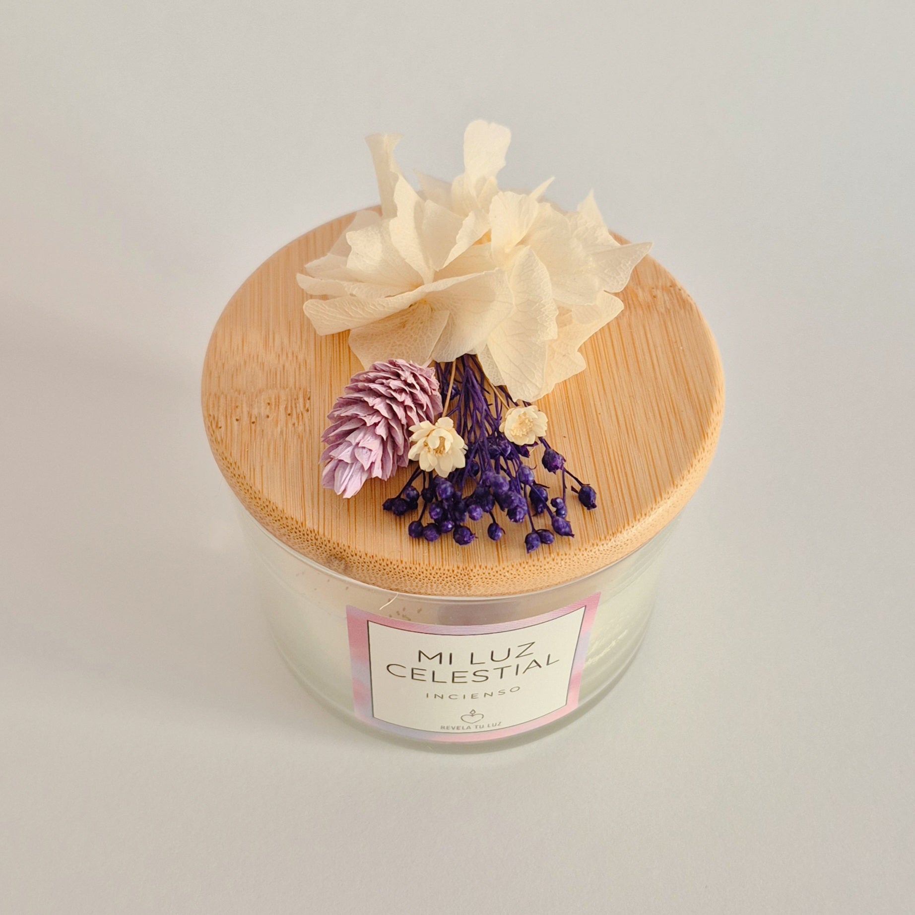 La pieza se completa con una tapa de madera natural y delicadas flores preservadas , que mantienen su belleza durante meses, convirtiendo cada vela en un objeto decorativo con alma incluso después de su uso.
