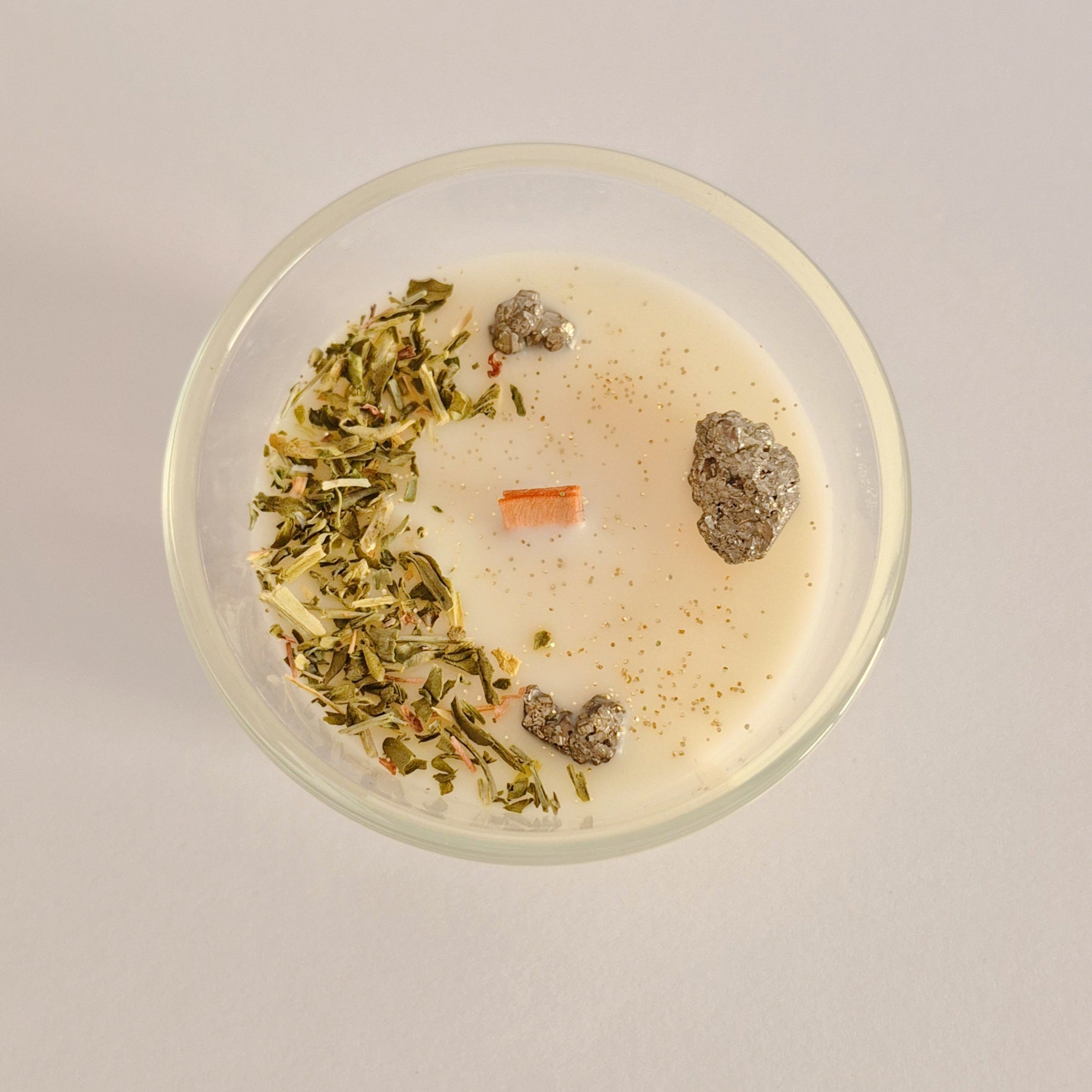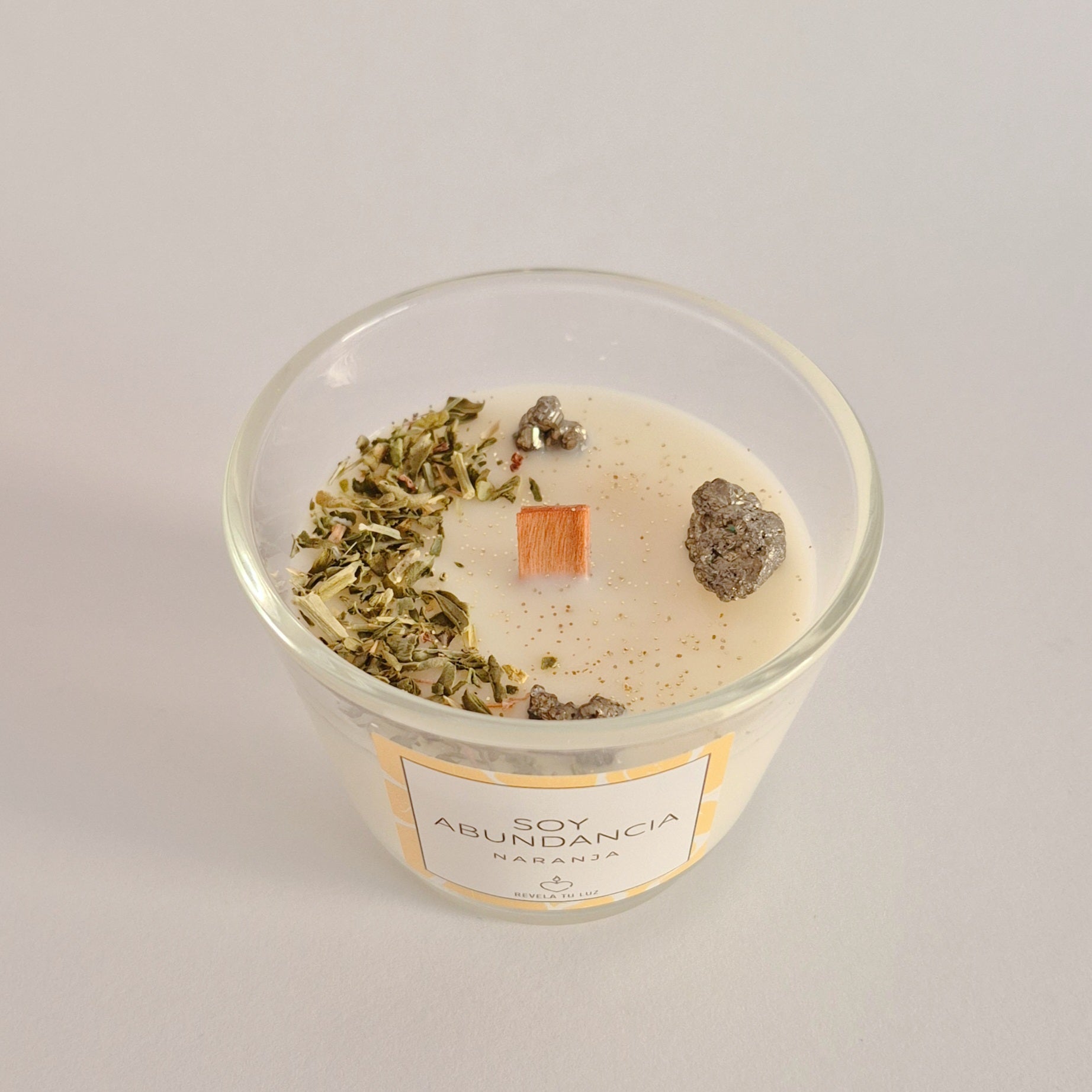 En su interior contiene Pirita , mineral asociado a la prosperidad, la protección energética y la atracción de riqueza, acompañada de ruda , planta utilizada habitualmente para limpiar y proteger la energía. Está decorado con purpurina biodegradable en tono dorado , que simboliza claridad, intención y manifestación.